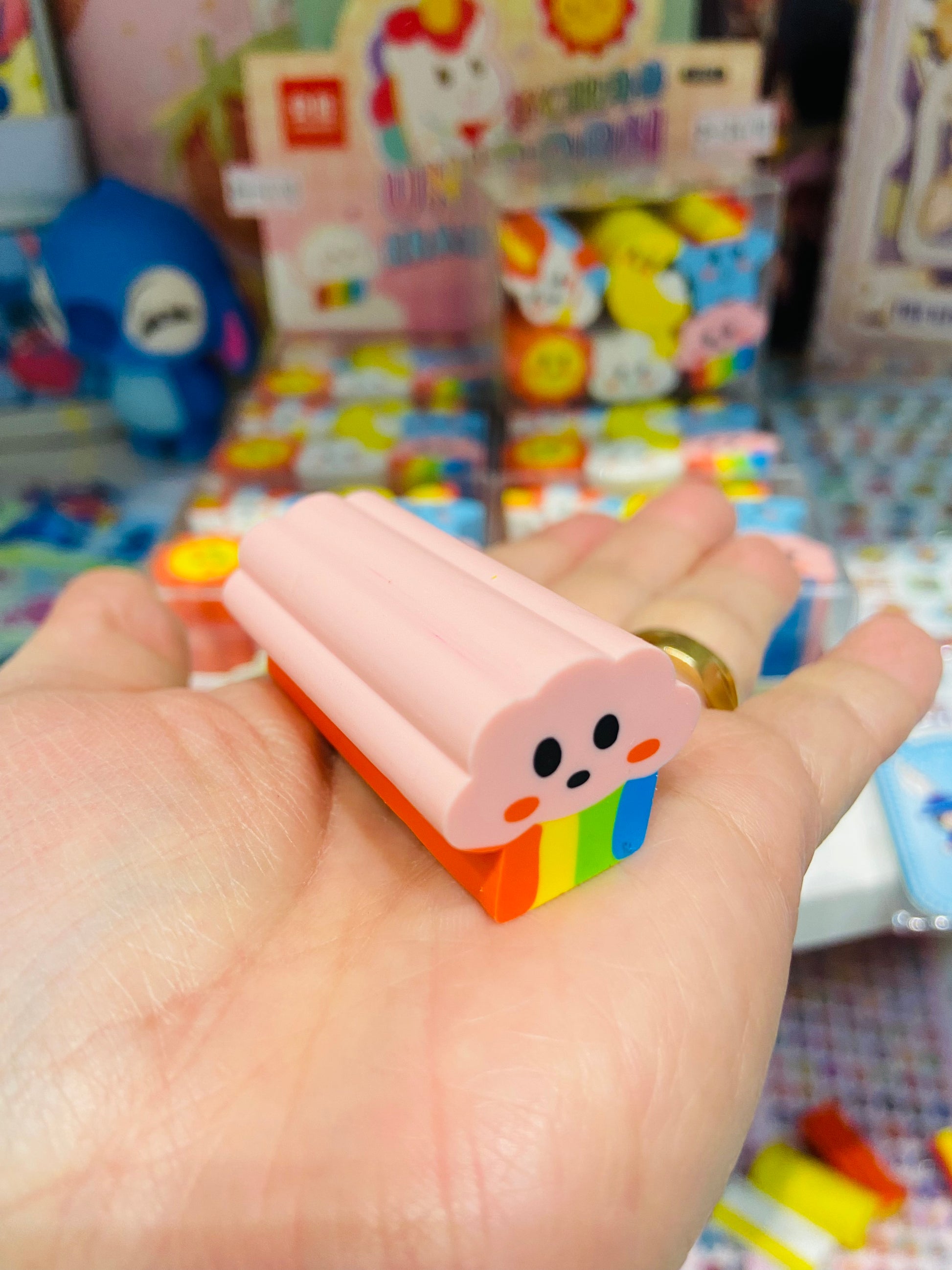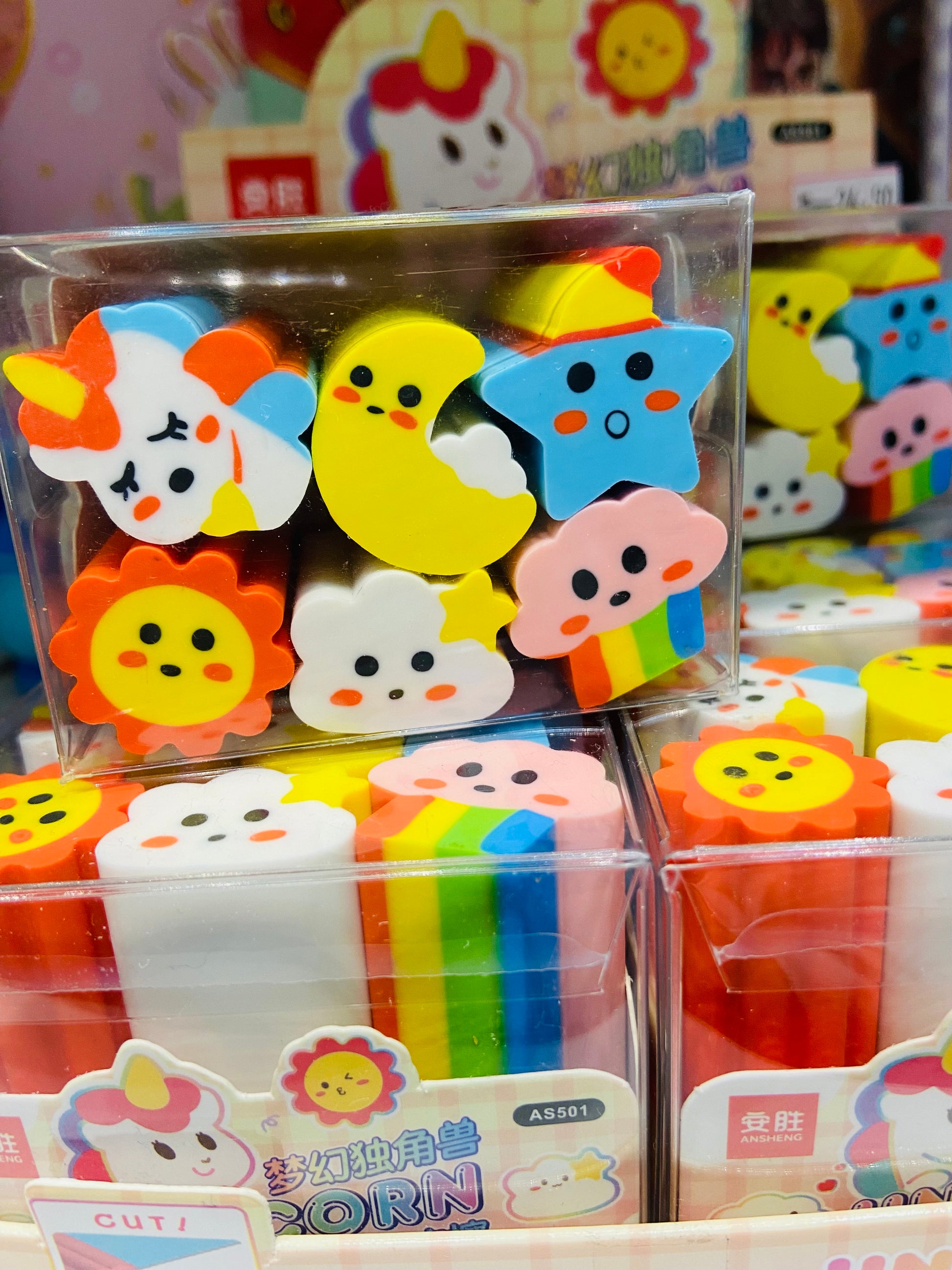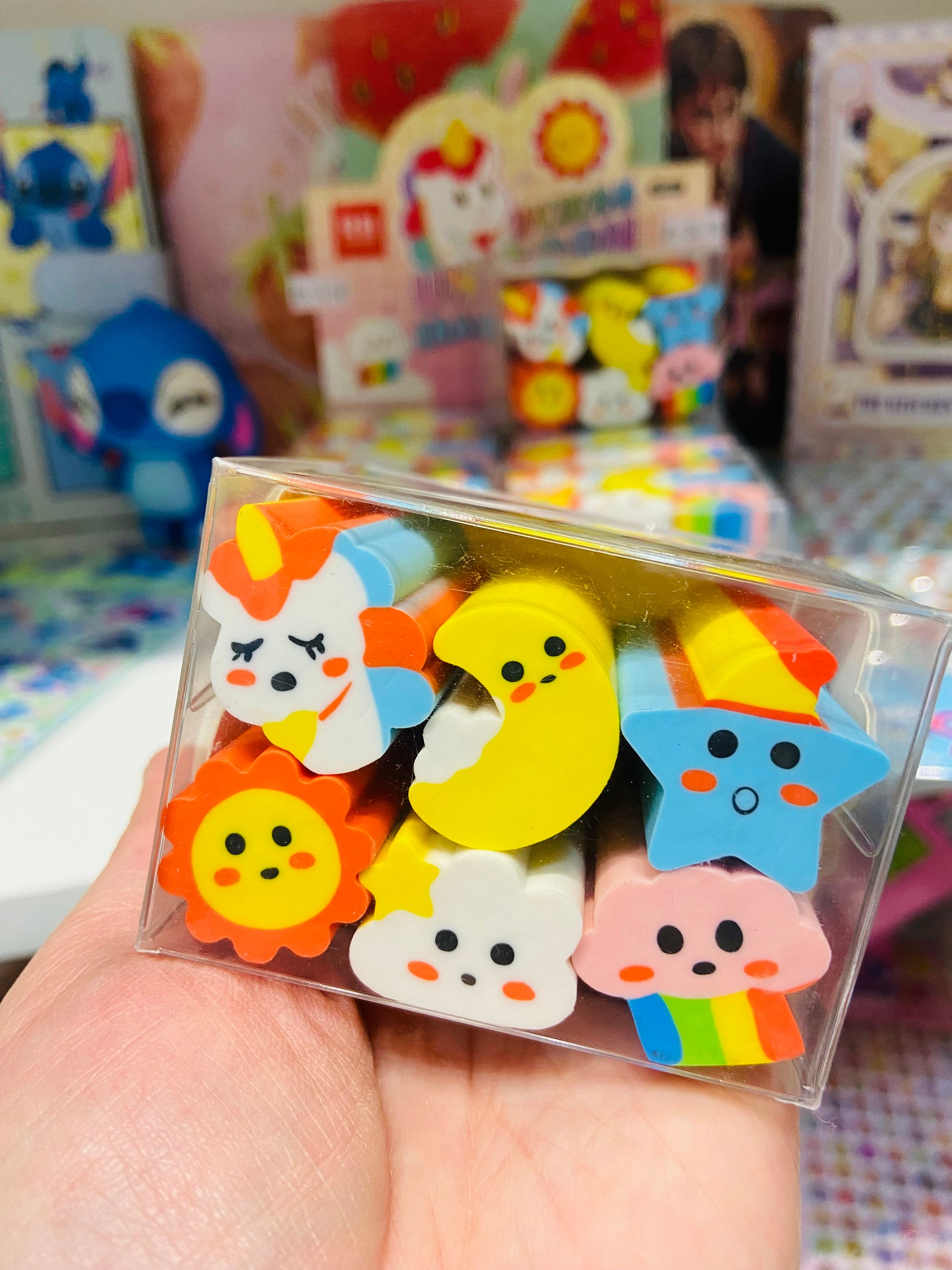 Kit contendo 6 borrachas para cortar: unicórnio, sol, nuvem, lua, estrela e arco íris!